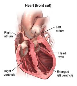 Heart (front cut), showing right and left atria, heart wall, right ventricle and enlarged left ventricle